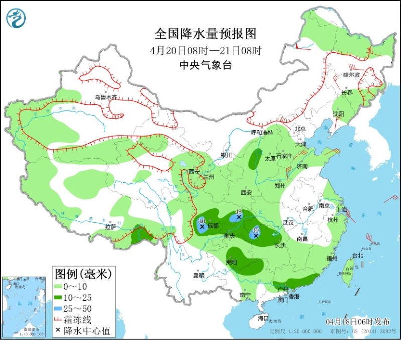 4月20日08時至21日08時,新疆南疆盆地西部山區(qū)、西藏北部和西部、青海西部、內(nèi)蒙古東北部、黑龍江西北部等地部分地區(qū)有小到中雪或雨夾雪,其中新疆西部山區(qū)、內(nèi)蒙古東北部等地局地有大雪。四川東部、重慶大部、湖南北部、貴州東南部、廣西北部、廣東南部、陜西北部等地部分地區(qū)有中雨,其中,四川東部、重慶北部、湖南西北部局地有大雨(25~45毫米)。內(nèi)蒙古東北部、東北地區(qū)、華北大部等地部分地區(qū)有4~6級風,其中內(nèi)蒙古東北部等地局地有7~8及陣風。