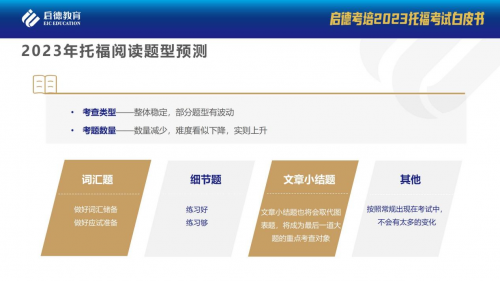 啟德考培認為23年托福閱讀考試從學科頻次預測生物類和歷史類考查較多,人類學、化學、物理、心理和語言學類別考查較少。從學科難度預測生物類和天文類較易得分,考古類和藝術類不易得分,具體難易程度因人而異。閱讀題型考查的類型整體穩(wěn)定,只有部分題型有波動;閱讀考題數(shù)量減少,難度看似下降,實則穩(wěn)步上升。閱讀詞匯題的難度趨近乎平穩(wěn),段落變長,長難句增多、詞匯量陡增,篇章的難度在2023 年將延續(xù)段落少且長的風格。