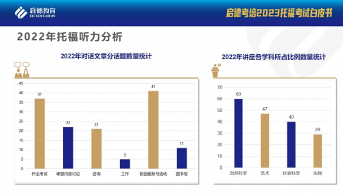 啟德考培認為2023年托福對話部分的話題依舊涉及學術和生活兩個方面。整體思路依然是問題的提出 - 問題的分析 - 問題的解決這一主體框架。23 年托福聽力整體難度還是會有一個上升的趨勢,對話部分的學術性會保持比較高的勢頭,課堂內(nèi)容討論以及作業(yè)類可能會持續(xù)增多。23年托福聽力講座部分話題四大科類不變,仍然是生物科學,藝術科學,自然科學和社會科學四大類別。動物、動物行為、植物和生物原理是生物類考查的四大巨頭,考查的側重點整體變化不大。藝術史和藝術家依舊會是考查重點,其中美術類仍是考查重點。天文學頻次會繼續(xù)居高不下,占據(jù)自然科學類別的老大位置。考古類類別是最常出現(xiàn)的考查點,出現(xiàn)概率高。
