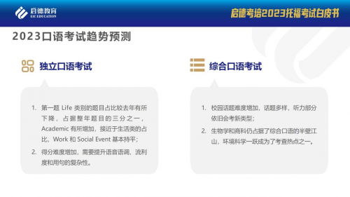 啟德考培預測2023年獨立口語考試第一題 Life 類別的題目占比較去年會有所下降,占據(jù)整年題目的三分之一,Academic 有所增加,接近于生活類的占比,Work 和 Social Event 基本持平。得分難度增加,需要提升語音語調、流利度和用句的復雜性。綜合口語考試校園話題難度增加,話題多樣,聽力部分依舊會考新類型;2023 年 Task 3 生物學話題仍然是考查的重中之重,會在全年考試中出現(xiàn)的較多,其次較多的會是商科和環(huán)境科學。而其余的話題(教育、社會學歷史等)均不會有太大的變化。