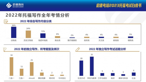 可以看到ETS在2022 年選擇了大量使用舊題來填充考試內(nèi)容(綜合和獨立寫作環(huán)節(jié)均有重復舊題),啟德考培根據(jù)歷年考情分析得出,重復舊題的情況也將在2023年繼續(xù)成為趨勢。一些經(jīng)典老題在 2022 年的消失也應該被視作是一個信號。獨立寫作話題方面,2023 年生活類考查頻次可能有所增加,但是波動不大,其中朋友以及價值觀類別考查會有所增加,特別是錢的使用方向的題目著重備考;教育類依舊占有絕對優(yōu)勢,其中學生類一直是考查之重;題型方面,二選一題目在 2023 年將仍保持高位;三選一題目與單一觀點緊隨其后;事實現(xiàn)象題目和絕對詞類基本穩(wěn)定。