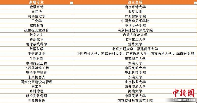 記者梳理發(fā)現(xiàn),21種新專業(yè)涉及10大類,包括金融審計、國際法、司法鑒定學(xué)、工會學(xué)、家庭教育、孤獨癥兒童教育、數(shù)字人文、資源化學(xué)、地球系統(tǒng)科學(xué)、數(shù)據(jù)科學(xué)、生物統(tǒng)計學(xué)、生物材料、電動載運工程、飛行器運維工程、安全生產(chǎn)監(jiān)管、未來機器人、國家公園建設(shè)與管理、醫(yī)工學(xué)、鄉(xiāng)村治理、航空安防管理、無障礙管理。