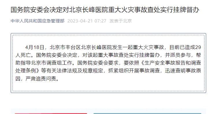 中新網(wǎng)4月21日電 據(jù)應(yīng)急管理部微信公眾號消息,4月18日,北京市豐臺區(qū)北京長峰醫(yī)院發(fā)生一起重大火災(zāi)事故,目前已造成29人死亡。國務(wù)院安委會決定,對該起重大事故查處實行掛牌督辦,并派員參與,幫助指導(dǎo)北京市調(diào)查組工作。國務(wù)院安委會要求,要依照《生產(chǎn)安全事故報告和調(diào)查處理條例》等有關(guān)法律法規(guī)及規(guī)章規(guī)定,抓緊組織開展事故調(diào)查,迅速查明事故原因,嚴(yán)肅追責(zé)問責(zé)。