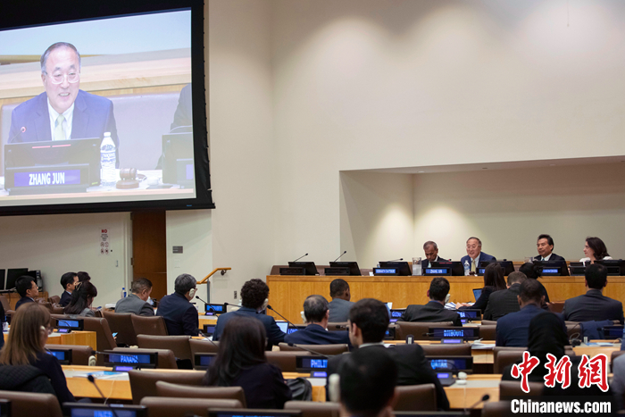 圖為中國(guó)常駐聯(lián)合國(guó)代表張軍發(fā)表講話(huà)。 中新社記者 王帆 攝