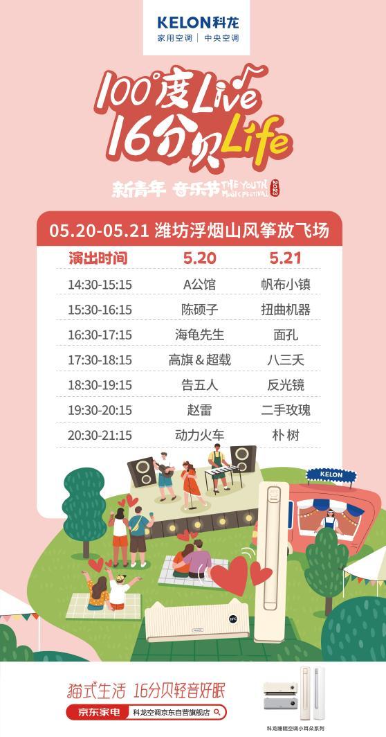 科龍空調x新青年音樂節(jié)5月20日浪漫來襲。動力火車、趙雷、樸樹、二手玫瑰、告五人、反光鏡等14支樂隊即將在鳶都濰坊集結,共同獻上一場連續(xù)兩天的浪漫狂歡。