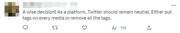 對推特的最新變化,有網(wǎng)友表示歡迎。“一個明智的決定!作為一個平臺,推特應該保持中立。要么給每個媒體上都打標簽,要么刪除所有標簽。”