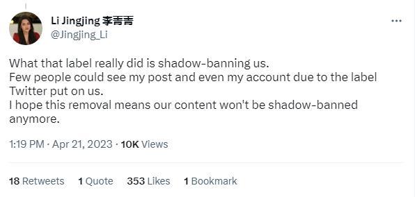 中國英文主持人李菁菁指出,推特的“官媒”標簽實際是一種“影子禁令”,為暗中設限提供方便?!坝捎谕铺亟o我們貼上了標簽,很少有人能看到我的帖子,甚至很難找到我的賬號。我希望這次刪除(標簽)意味著我們發(fā)布的內(nèi)容不會再被暗中禁止。”