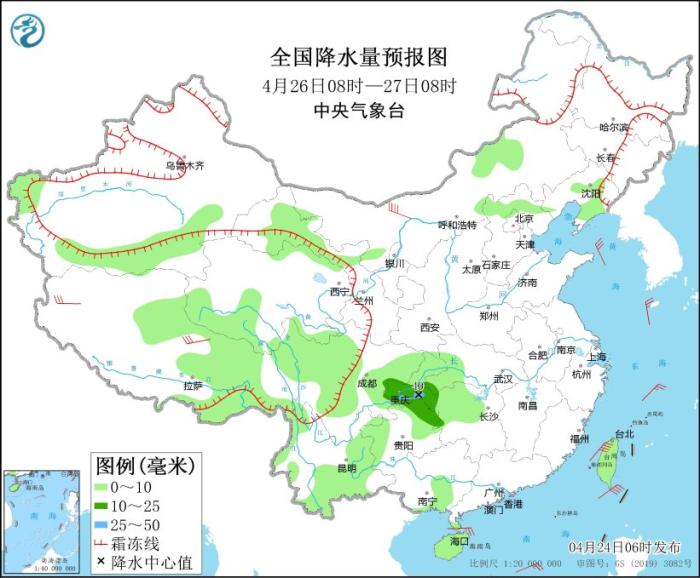 全國(guó)降水量預(yù)報(bào)圖(4月25日08時(shí)-26日08時(shí))
