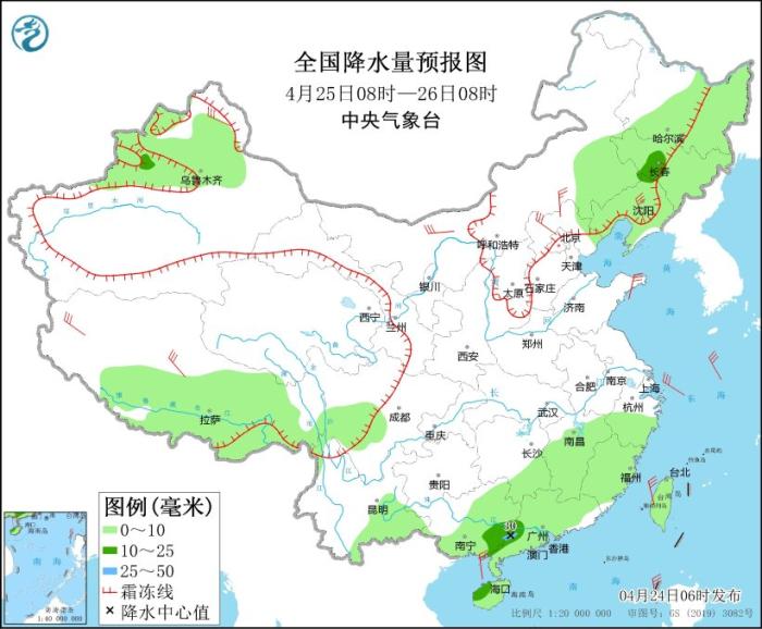 4月25日08時(shí)至26日08時(shí),新疆沿天山地區(qū)、西藏南部、川西高原、內(nèi)蒙古東部、黑龍江西部等地部分地區(qū)有小雪或雨夾雪;新疆北部、西南地區(qū)南部、江南南部、華南大部、東北地區(qū)大部、海南島等地部分地區(qū)有小到中雨,其中,廣西東南部、廣東西南部等地局地有大雨(25~30毫米)。新疆北疆東部、西藏北部和西部、內(nèi)蒙古西部、遼寧中部、河北北部、山東半島等地部分地區(qū)有4~6級(jí)風(fēng)。
