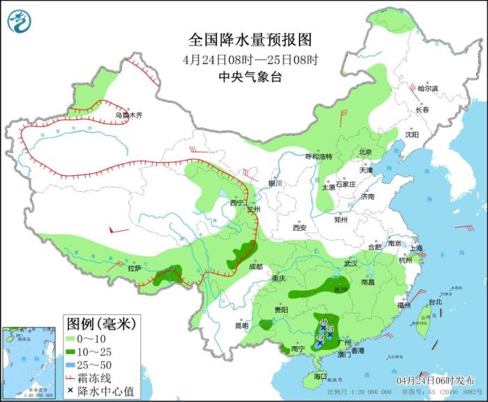 全國(guó)降水量預(yù)報(bào)圖(4月24日08時(shí)-25日08時(shí))