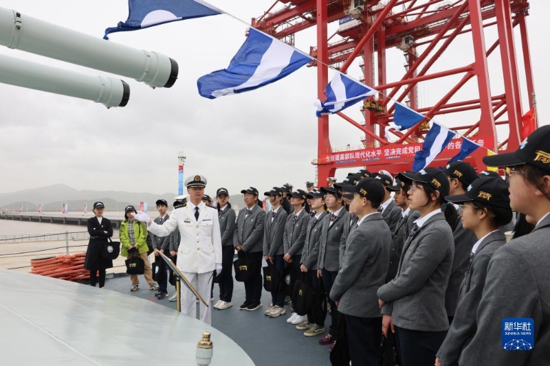 4月23日,海軍組織“戰(zhàn)艦與城市”雙擁共建主題活動,寧波市師生代表參觀寧波艦。新華社發(fā)(孟印祺 攝)