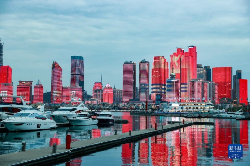 在山東青島浮山灣,大樓樓體亮化構(gòu)成的巨幅熒屏上演海軍主題燈光秀(4月22日攝)。新華社發(fā)(劉再耀 攝)