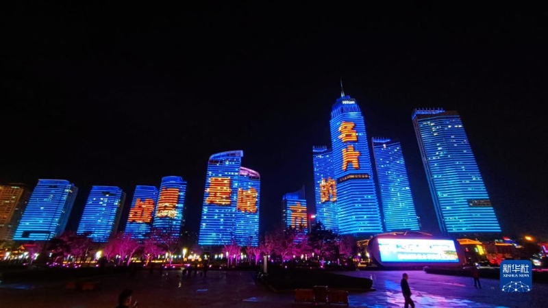 在山東煙臺濱海廣場,高樓組成的巨幅熒屏上演海軍主題燈光秀(4月21日攝)。新華社發(fā)(吳江洪 攝)