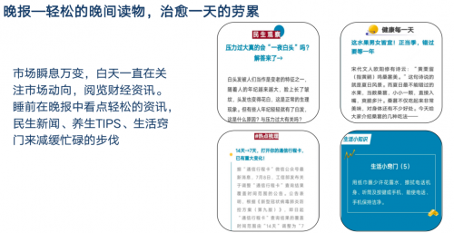 財經晚報,內容定位:睡前心靈治愈、理財干貨分享,工作日每天下午19:30 - 20:00之間上架,日更1篇,以圖文方式進行呈現(xiàn)。輕松的晚間讀物,治愈一天的勞累。睡前在晚報中看點輕松的資訊,民生新聞、養(yǎng)生TIPS、生活竅門來減緩忙碌的步伐。