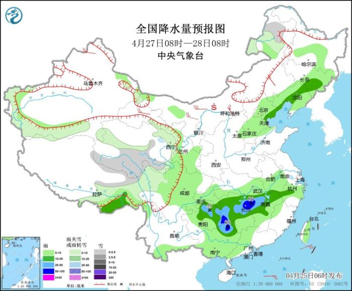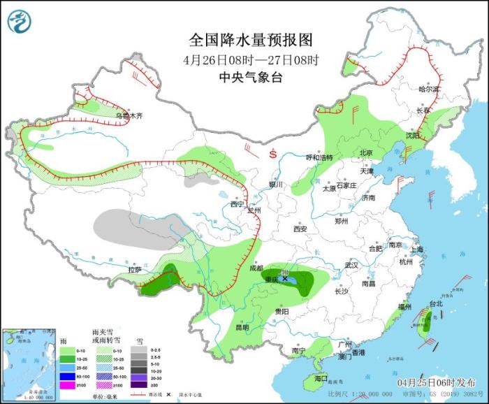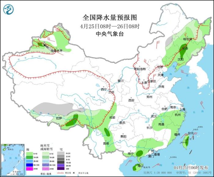 4月25日08時至26日08時,新疆北疆北部和沿天山地區(qū)、內(nèi)蒙古東部、黑龍江中東部和西部、吉林東部、西藏東北部和南部、川西高原北部等地部分地區(qū)有小到中雪或雨夾雪,其中,新疆沿天山地區(qū)局地有大雪。新疆北部、內(nèi)蒙古東南部、東北地區(qū)大部、西藏東南部、四川盆地西部、云南東部、江南中東部、華南中北部和南部、臺灣島等地部分地區(qū)有小到中雨。新疆北部、內(nèi)蒙古中東部、東北地區(qū)大部、華北北部等地部分地區(qū)有4~6級風,其中,新疆北疆北部部分地區(qū)有6~7級風。渤海、渤海海峽、黃海北部海域、東海北部海域?qū)⒂?~7級、陣風8級的風。