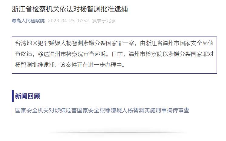 中新網(wǎng)4月25日電 最高人民檢察院官方微信公眾號25日發(fā)布消息,臺灣地區(qū)犯罪嫌疑人楊智淵涉嫌分裂國家罪一案,由浙江省溫州市國家安全局偵查終結,移送溫州市檢察院審查起訴。日前,溫州市檢察院以涉嫌分裂國家罪對楊智淵批準逮捕。該案件正在進一步辦理中。