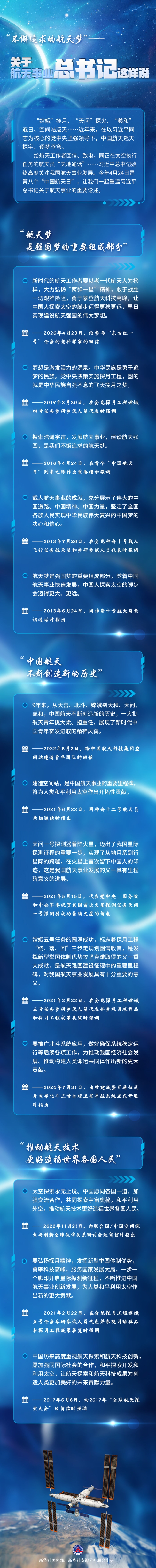 給航天工作者回信、致電,同正在太空執(zhí)行任務(wù)的航天員“天地通話”……習(xí)近平總書記始終高度關(guān)注我國航天事業(yè)發(fā)展。今年4月24日是第八個“中國航天日”,讓我們一起重溫習(xí)近平總書記關(guān)于航天事業(yè)的重要論述。