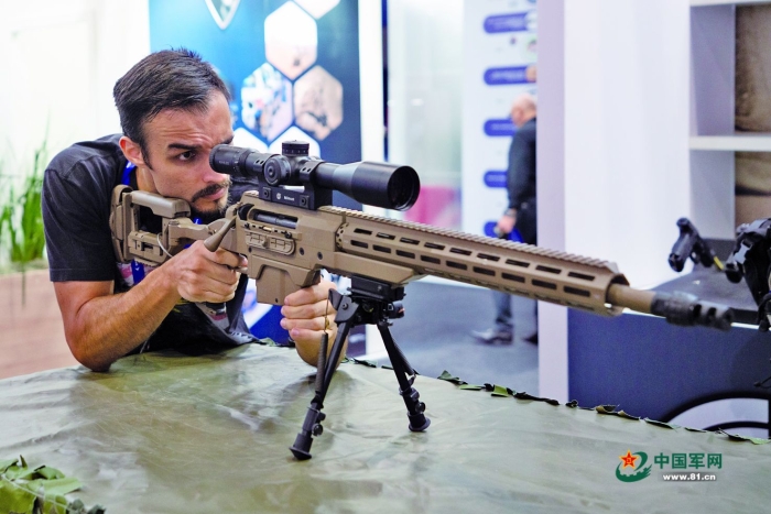 一名參觀者在巴西防務(wù)展上體驗操作狙擊步槍的偵瞄系統(tǒng)。