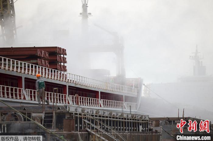 資料圖:一艘土耳其貨船在烏克蘭敖德薩地區(qū)的港口裝載谷物。