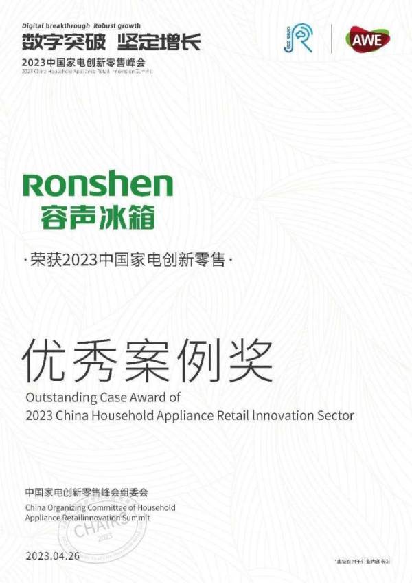 4月26日,“2023中國(guó)家電創(chuàng)新零售峰會(huì)”在上海盛大召開(kāi)。憑借在新零售領(lǐng)域的創(chuàng)新突破,容聲冰箱實(shí)力斬獲“2023中國(guó)家電創(chuàng)新零售先鋒品牌獎(jiǎng)”。