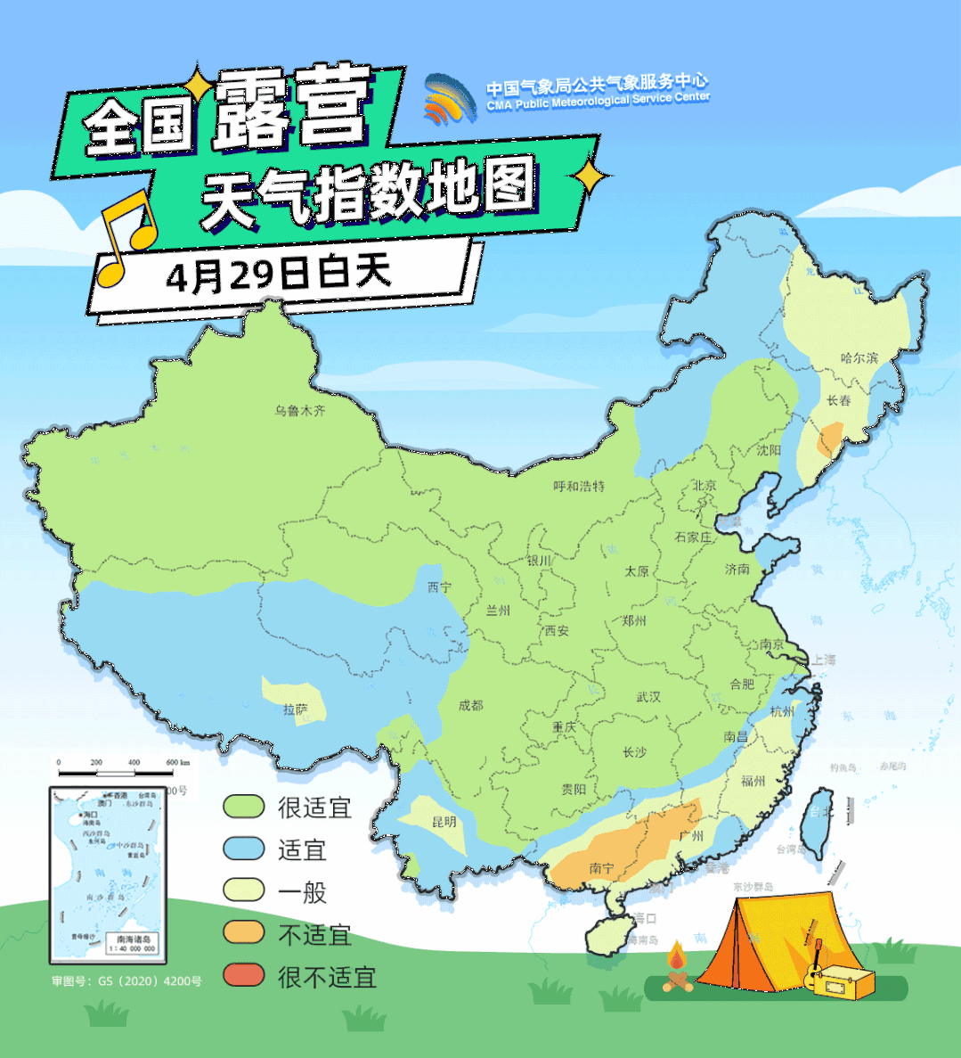 【白天】4月29日,東北南部、華南中西部,5月2日新疆東北部、西藏東部、江南中西部、江淮及重慶東南部、廣西北部等地部分地區(qū),5月3日江南北部、江淮南部等地將相繼出現(xiàn)不適宜或很不適宜的露營氣象等級。
