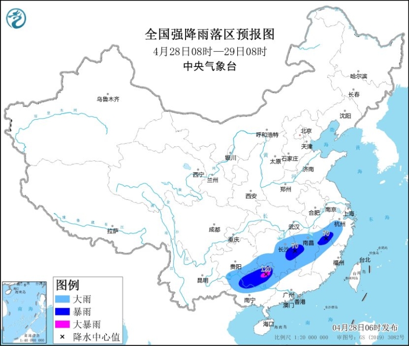 4月28日08時至29日08時,貴州東南部、湖南中南部、江西大部、浙江西部、福建西北部、廣西北部等地部分地區(qū)有大到暴雨,其中,廣西東北部等地部分地區(qū)有大暴雨(100~120毫米)。上述部分地區(qū)伴有短時強降水(最大小時降雨量20~50毫米,局地可超過60毫米),局地有雷暴大風等強對流天氣。中央氣象臺4月28日06時發(fā)布暴雨藍色預警。29日,南方降雨明顯減弱,廣東、廣西部分地區(qū)有中到大雨,局地暴雨。