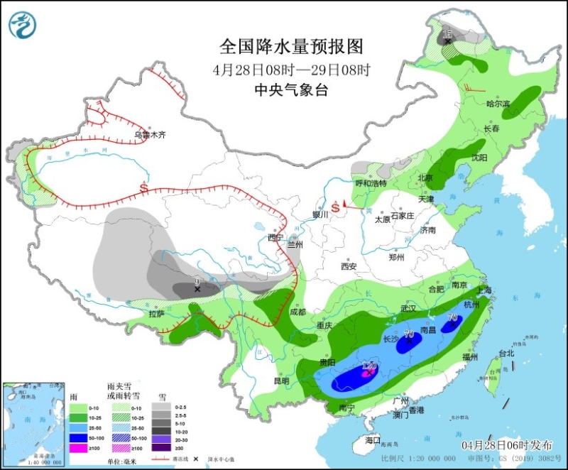 4月28日08時至29日08時,內(nèi)蒙古東北部、黑龍江西北部、新疆南疆盆地西部、西藏北部和東部、青海南部和西部、川西高原北部等地部分地區(qū)有小到中雪或雨夾雪,其中,內(nèi)蒙古東北部、西藏東北部等地部分地區(qū)有大到暴雪(10~15毫米)。遼寧西部、西藏東南部、河北東北部、江南大部、西南地區(qū)東南部、華南北部和西部等地部分地區(qū)有中到大雨,其中,湖南東部、江西中北部、福建西北部、浙江西部、廣西北部等地部分地區(qū)有暴雨或大暴雨(100~120毫米)。內(nèi)蒙古中西部部分地區(qū)有4~6級風,陜西北部局地有7~8級風。