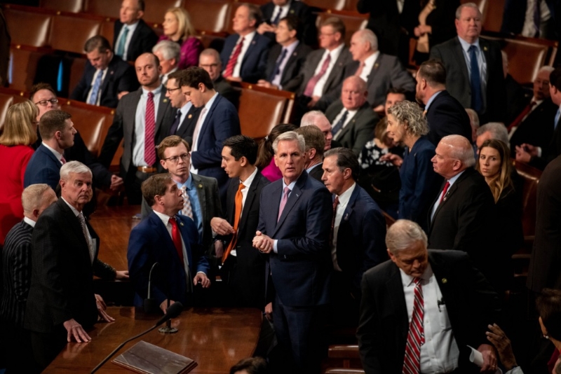 這是1月6日在美國華盛頓國會拍攝的凱文·麥卡錫(中)。新華社記者劉杰攝