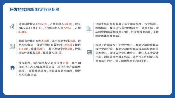 在技術(shù)研發(fā)方面,公司以技術(shù)創(chuàng)新夯實(shí)企業(yè)根基,助推企業(yè)核心競(jìng)爭(zhēng)力進(jìn)一步提升,2022年研發(fā)投入1.97億元,占營(yíng)業(yè)收入3.03%,新增有效境內(nèi)專利236項(xiàng),其中,發(fā)明專利26項(xiàng)。截至報(bào)告期末,公司共擁有有效專利1,246項(xiàng)(境內(nèi)1161項(xiàng)、境外85項(xiàng)),其中發(fā)明專利52項(xiàng)。恒林股份作為國(guó)家高新技術(shù)企業(yè)、國(guó)家知識(shí)產(chǎn)權(quán)優(yōu)勢(shì)企業(yè),積極開(kāi)展知識(shí)產(chǎn)權(quán)工作,獲得國(guó)家和政府的一致認(rèn)可。