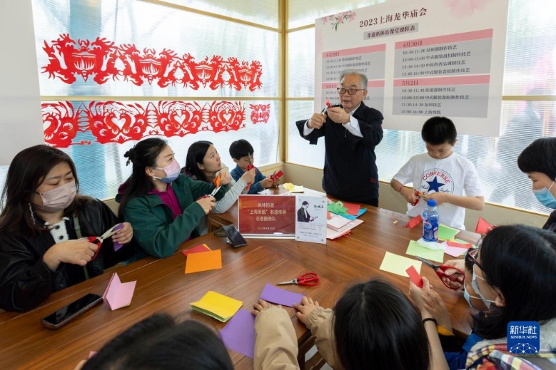 4月29日,人們在龍華廟會上體驗剪紙課程。