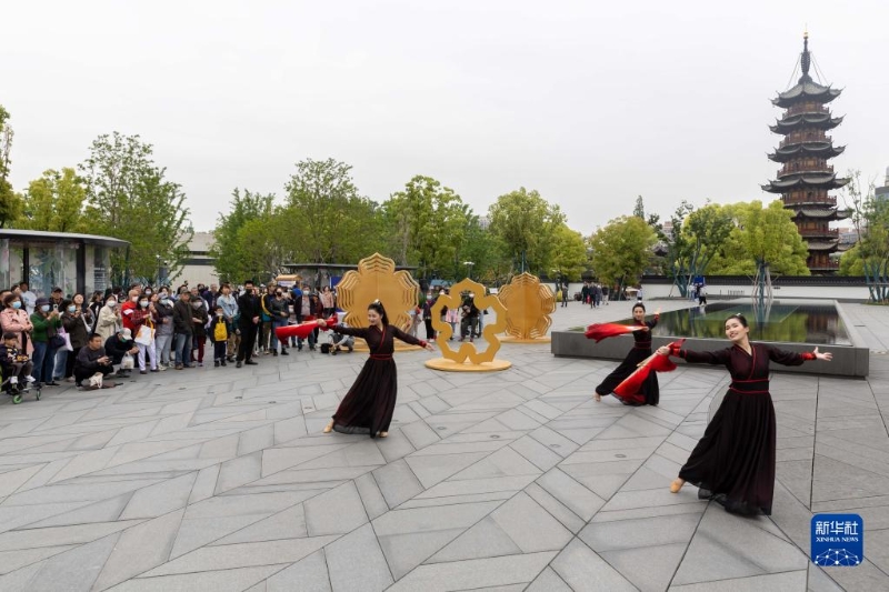 4月29日,人們在龍華廣場觀看國風舞蹈表演。