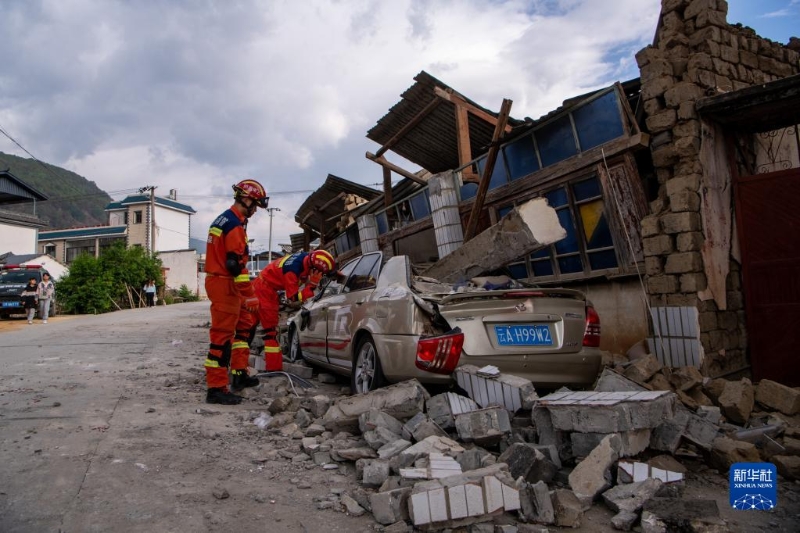 5月3日,應(yīng)急救援人員在云南省保山市隆陽區(qū)瓦窯鎮(zhèn)排查受損的房屋和車輛。新華社記者 江文耀 攝