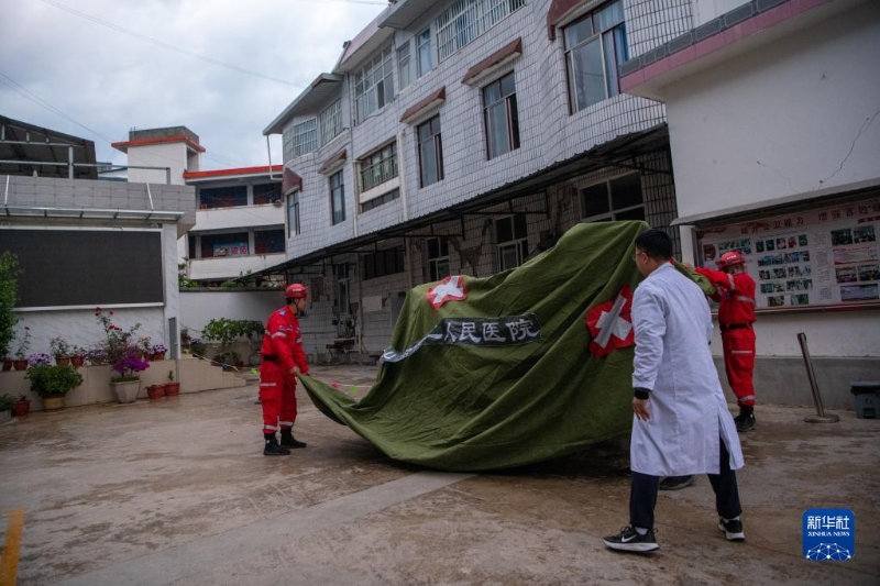 5月3日,應(yīng)急救援人員在云南省保山市隆陽區(qū)瓦窯鎮(zhèn)中心衛(wèi)生院搭建帳篷。新華社記者 江文耀 攝