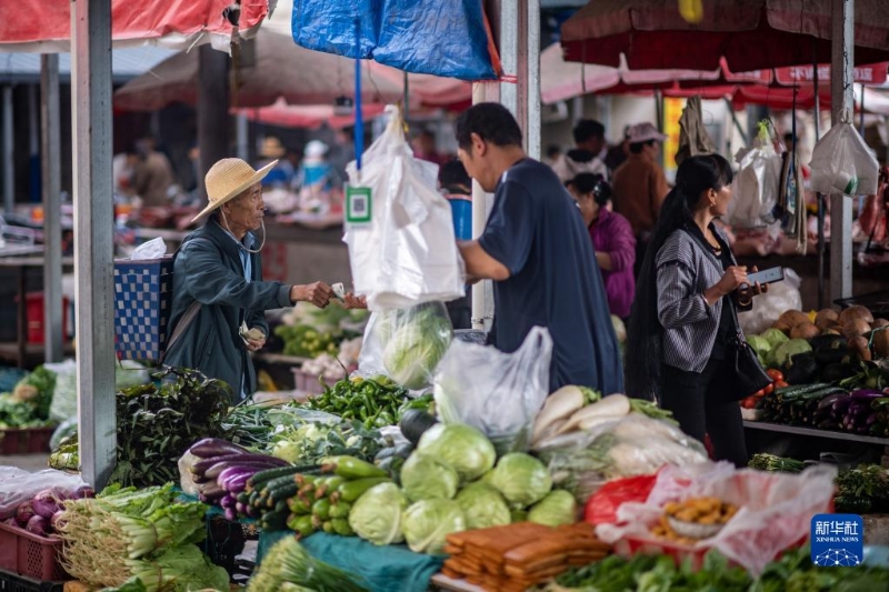 5月3日,村民在云南省保山市隆陽區(qū)瓦窯鎮(zhèn)集貿(mào)市場(chǎng)購買新鮮蔬菜。新華社記者 江文耀 攝