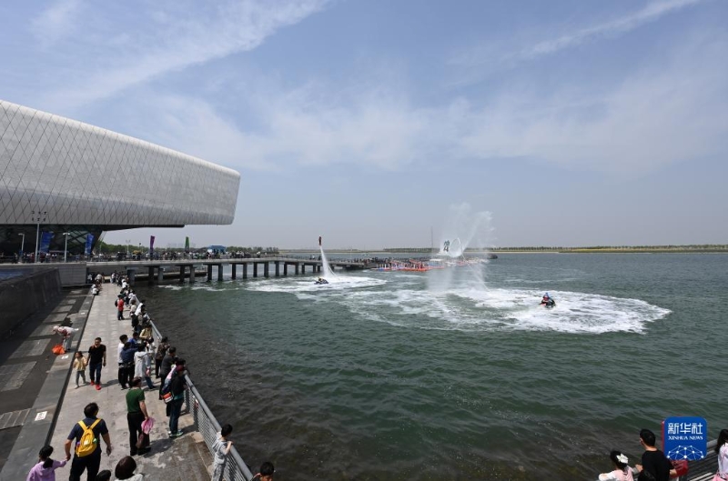 5月3日,游客在位于天津市濱海新區(qū)的國家海洋博物館室外觀看水上特技表演。