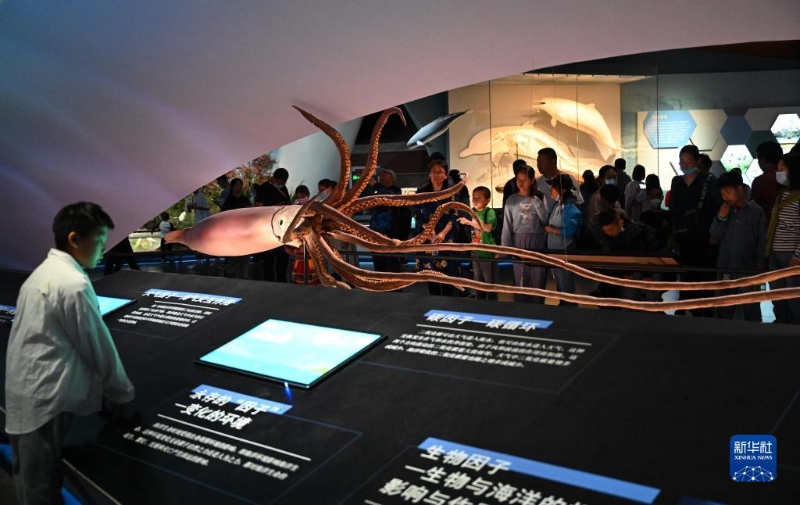 5月3日,游客在位于天津市濱海新區(qū)的國家海洋博物館“今日海洋”展廳參觀。