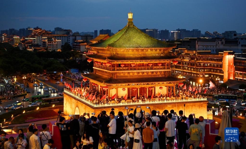 5月2日,在陜西西安,游客在觀景平臺欣賞鐘樓夜景。