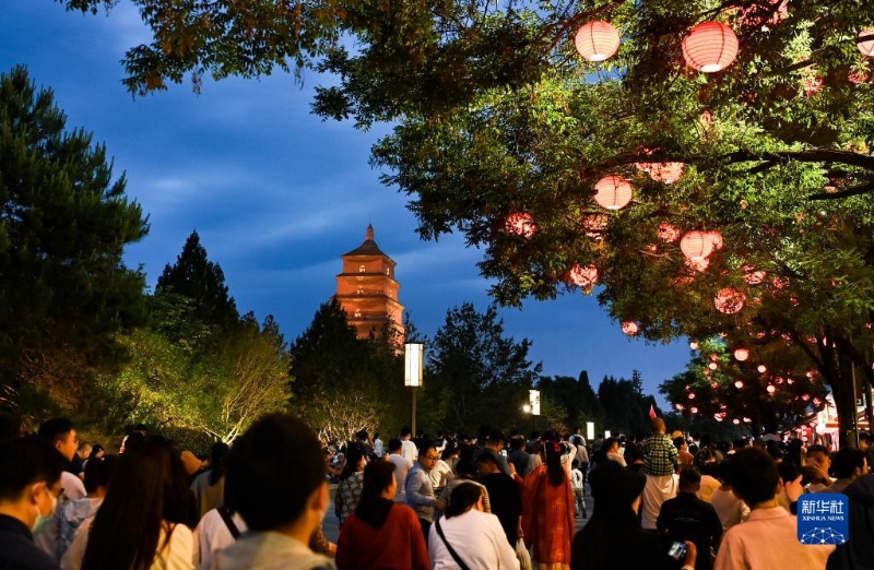 5月1日,游客在西安大雁塔文化休閑景區(qū)參觀游覽。