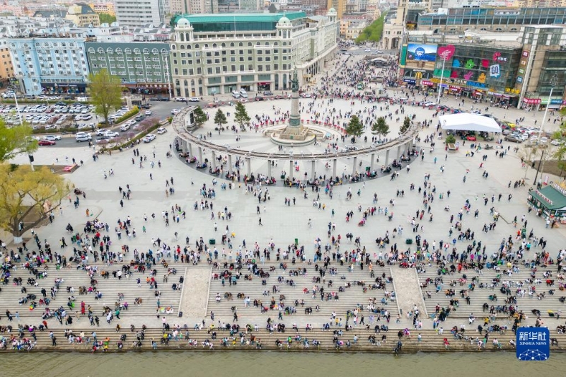 5月3日,人們在哈爾濱防洪紀念塔廣場游玩(無人機照片)。