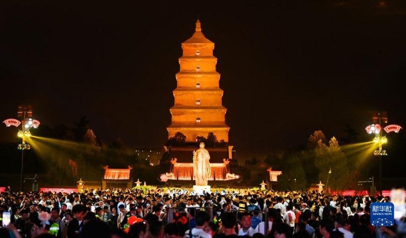 4月30日,游客在西安城墻景區(qū)觀看演出《夢長安——大唐迎賓盛禮》。