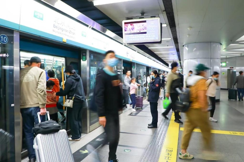 “大家進站時要小心腳下的行李箱?!?日14時,隨著大量鐵路旅客抵達北京南站,地鐵4號線北京南站也開始變得忙碌。站廳內(nèi),工作人員在自動售票機、閘機前引導旅客快速購票進站;站臺上,軌道列車準時抵達,乘客快速流動疏散。
