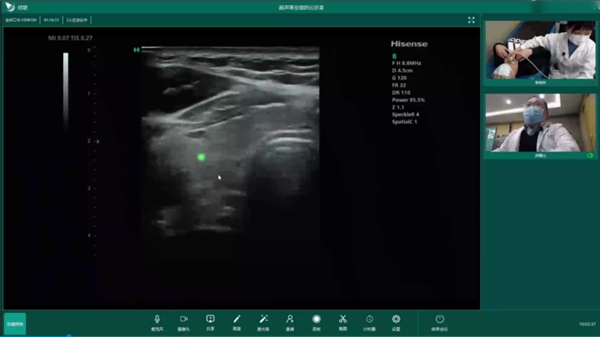 在遠(yuǎn)程超聲方面,海信醫(yī)療自研信聯(lián)遠(yuǎn)程超聲診斷系統(tǒng),采用現(xiàn)代通訊、電子和多媒體計(jì)算機(jī)技術(shù),實(shí)現(xiàn)了超聲遠(yuǎn)程實(shí)時(shí)診斷、遠(yuǎn)程教學(xué)、在線質(zhì)控和交流。前不久,在青島,超聲專家與遠(yuǎn)在1600多公里之外的定西市通渭縣平襄社區(qū)衛(wèi)生服務(wù)中心進(jìn)行了遠(yuǎn)程超聲會(huì)診,基層超聲醫(yī)生使用海信超聲為患者進(jìn)行超聲檢查,遠(yuǎn)端專家在線實(shí)時(shí)進(jìn)行操作指導(dǎo)和病例會(huì)診,會(huì)診大屏同步顯示清晰動(dòng)態(tài)的超聲圖像。會(huì)診過程中,聲音和畫面均做到了同步無延時(shí),遠(yuǎn)程超聲讓基層醫(yī)生和遠(yuǎn)端專家感受到身臨其境的會(huì)診體驗(yàn)。