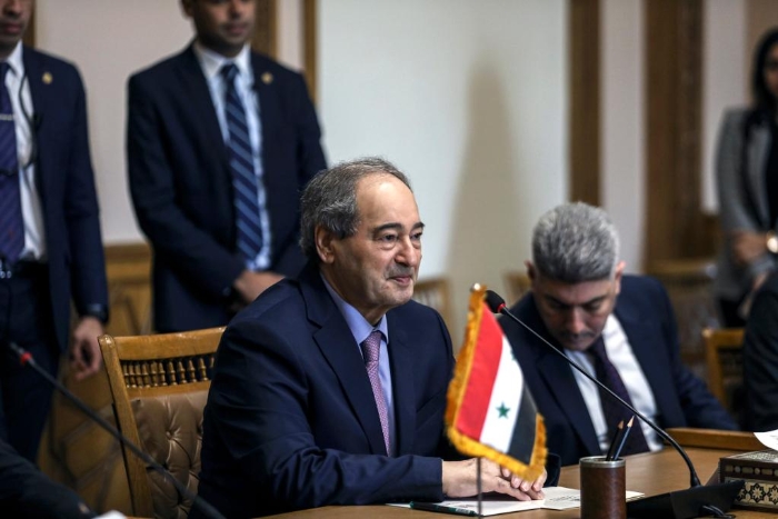 4月1日,在埃及首都開羅,敘利亞外長梅克達(dá)德(中)與埃及外長舒凱里(不在畫面中)舉行會談。這是敘利亞外長時隔十余年后首次訪問埃及。新華社發(fā)(艾哈邁德·戈馬攝)
