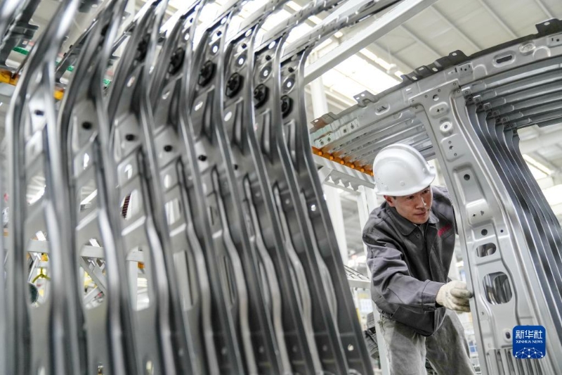 5月4日,在浙江省湖州市長興經(jīng)濟(jì)技術(shù)開發(fā)區(qū)一家汽車部件有限公司,工人生產(chǎn)新能源汽車T型梁。