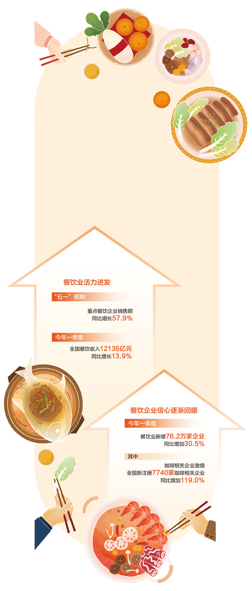 餐飲業(yè)是促消費、惠民生、穩(wěn)就業(yè)的重點領(lǐng)域。今年以來,餐飲消費一直呈現(xiàn)加快恢復(fù)向好態(tài)勢,一季度全國餐飲收入同比增長13.9%,餐飲業(yè)新增企業(yè)數(shù)同比增加30.5%。餐飲業(yè)加快恢復(fù)向好、持續(xù)激發(fā)活力,為恢復(fù)和擴大消費提供有力支撐。