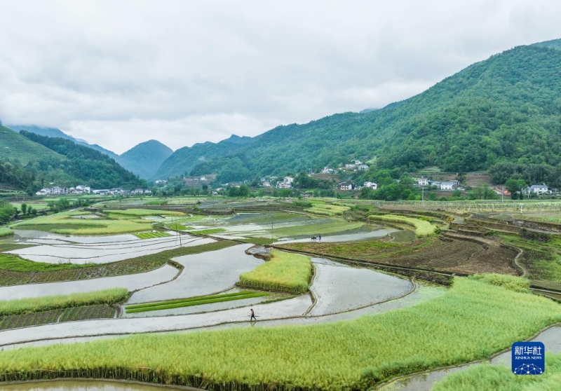 5月5日,湖北省宜昌市秭歸縣九畹溪鎮(zhèn)石柱村村民在平整水田,準(zhǔn)備栽秧(無人機(jī)照片)。