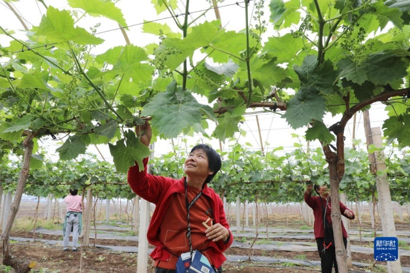 5月5日,河南省焦作市溫縣番田鎮(zhèn)后楊壘村農(nóng)民在田間管理葡萄。