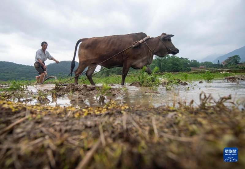 5月5日,在湖南省永州市道縣清塘鎮(zhèn)室家村,農(nóng)民在耕犁農(nóng)田。