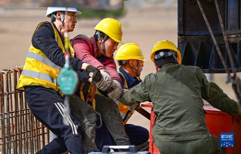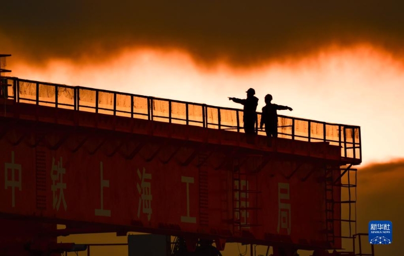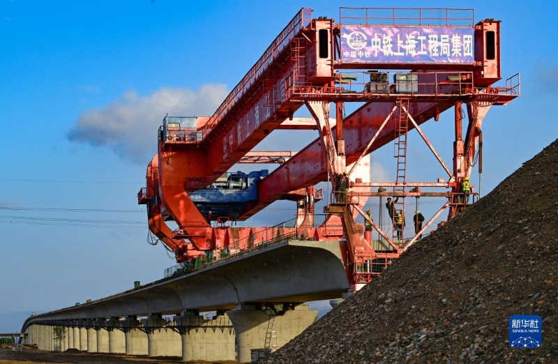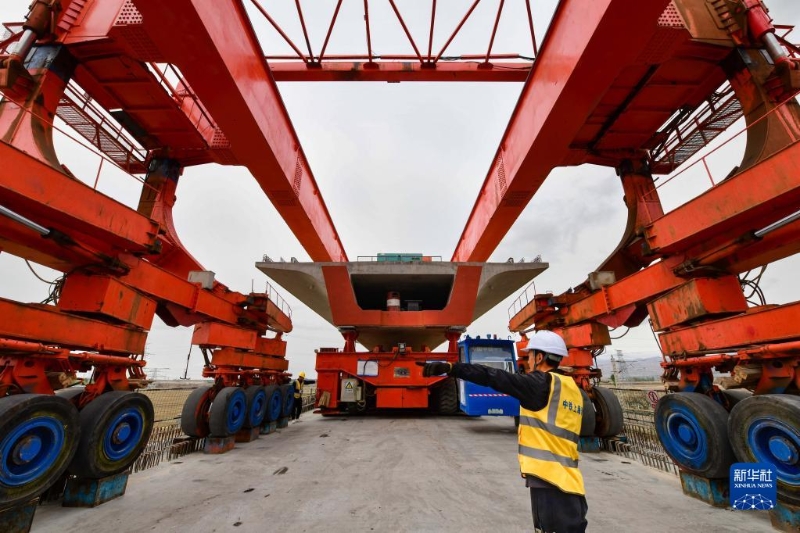 5月5日拍攝的包銀高鐵跨萬甘鐵路特大橋箱梁架設(shè)施工現(xiàn)場(無人機(jī)照片)。