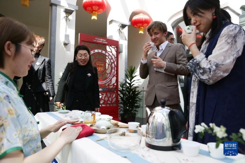 5月4日,人們在比利時布魯塞爾的中國文化中心品茗。